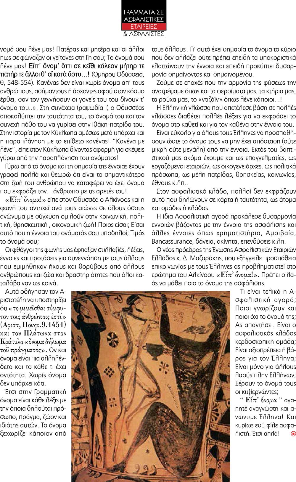 Ο νέος πρόεδρος της Ένωσης Ασφαλιστικών Εταιριών Ελλάδος κ. Δ. Μαζαράκης, που εξήγγειλε προσπάθεια επικοινωνίας με τους Έλληνες ας προβληματιστεί στο ερώτημα του Αλκίνοου «Εἴπ᾿ ὄνομα!». Πρέπει ο λαός να μάθει ποιο το όνομα της ασφάλισης.